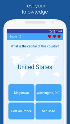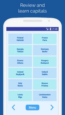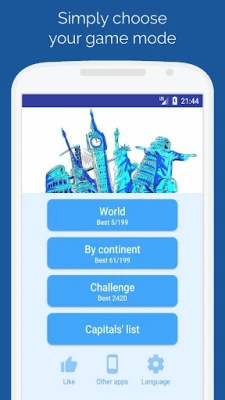 - Several game modes are available: world quiz, quiz by continent... - And a challenge for those who like competition! - You can review and learn the capitals of all the countries by using the list mode. - It contains the capitals of the 199 countries. - It is user friendly.