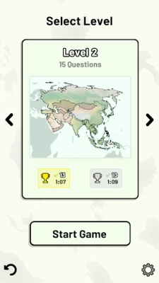 Standard quizzes allow you to learn each topic by progressing through a series of levels, each covering additional countries.