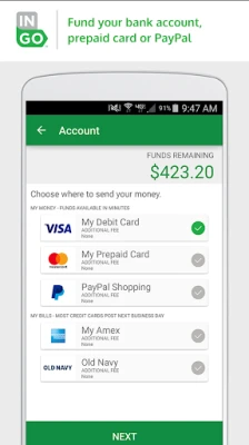 The Ingo Money App may be used by identity-verified customers to cash checks issued on U.S. financial accounts to fund: (1) most debit, prepaid and credit card accounts issued by hundreds of U.S. financial institutions including Chase®, Bank of America®, Citi®, Wells Fargo®, American Express®, U.S. Bank®, PNC Bank®, Capital One®, HSBC Bank USA, TD Bank, Discover®, Synchrony Bank, First Premier® Bank, Pathward and The Bancorp Bank; (2) PayPal™, PayPal™ for Business and PayPal™ Prepaid MasterCard® accounts; and (3) most prepaid cards, including Chase Liquid®, Wells Fargo EasyPay®, Regions Now Card®, BB&T MoneyAccount®, NetSpend®, Green Dot® Prepaid Debit, Walmart MoneyCard®, H&R Block® Emerald Card®, ACE Elite™, AccountNow®, Kroger® 1-2-3 REWARDS® and more. Funds may also be used to pay retail credit card bills from thousands of retailers including Walmart®, Target®, Costco®, Home Depot®, Lowe’s®, BestBuy®, Gap® and Old Navy®. You can also access the Ingo Money service in dozens of mobile banking apps including American Express Serve® and Bluebird by American Express. Ingo Money participates in the Visa®, MasterCard®, American Express®, Star®, Pulse®, NYCE® and Maestro® payment networks.