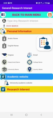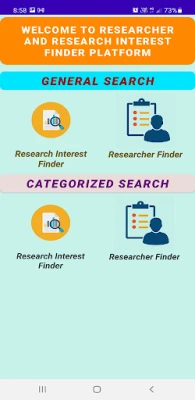 A Comprehensive Researcher and Research Interest Finder Platform provides two main types of search engines: A. Search about any researcher in any university around the world by typing any part of his/her name in Arabic or English language. B. Search about any research interest of any researcher in any university around the world by typing any keyword that is related to the research interest. The two main types of search engines are consist of two main classifications: General and Categorized.